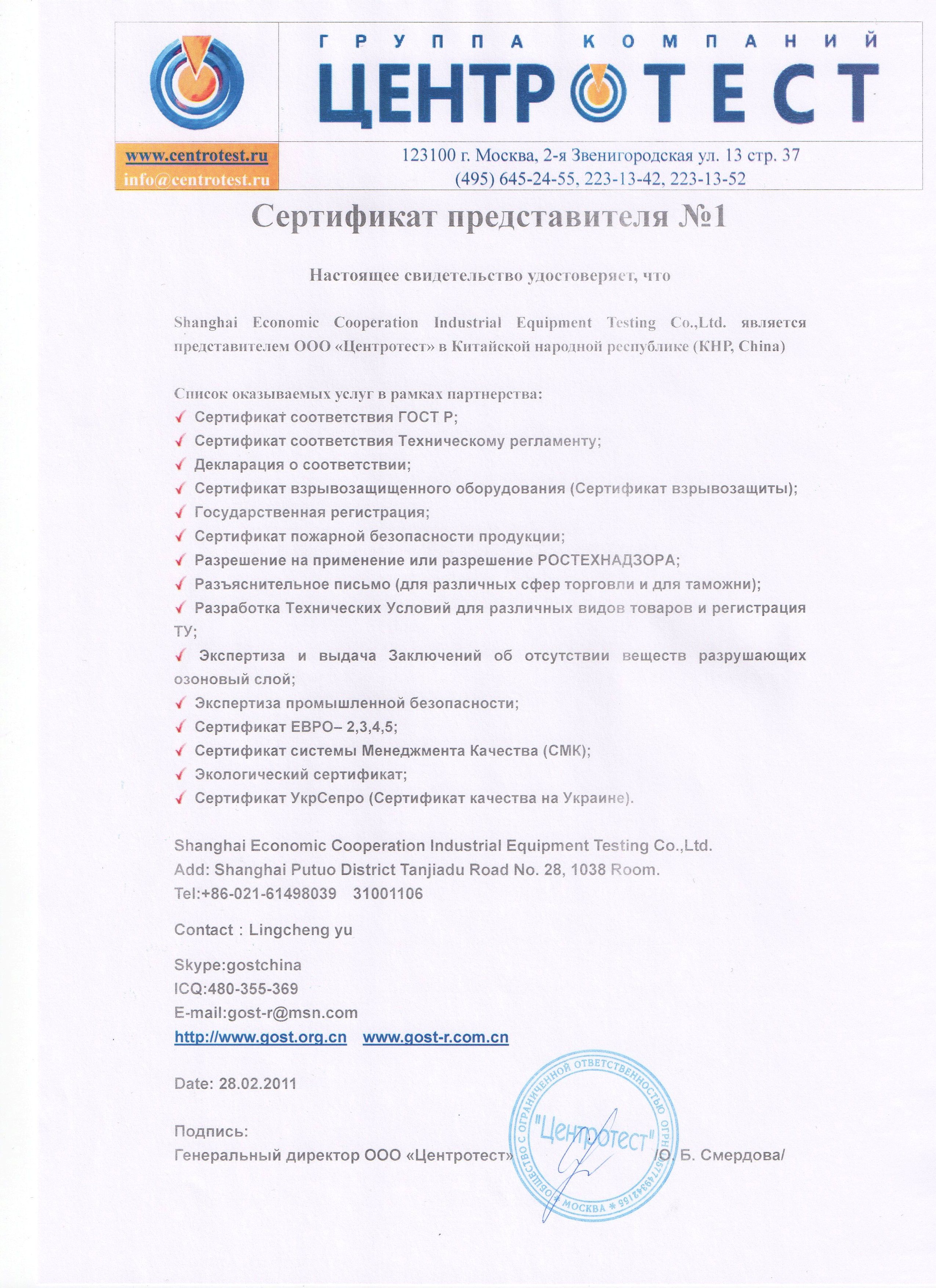 2011年2月我公司經(jīng)過和俄羅斯測(cè)試認(rèn)證中心«Центротест»多次的合作,«Центротест»是俄羅斯最知名的認(rèn)證測(cè)試實(shí)驗(yàn)室和發(fā)證機(jī)構(gòu),是俄羅斯政府授權(quán)的眾多產(chǎn)品的權(quán)威實(shí)驗(yàn)室之一,在合作過程中«Центротест»對(duì)我公司的專業(yè)知識(shí)和水平和服務(wù)非常的滿意,授權(quán)我們?yōu)槿虻谝患襈o.1海外辦事處。